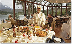 | Our Welcoming restaurant daily provides an excellent service of gastronomy, using in each one of its delicious dishes typical Chilean ingredients. Best service and highest standards of quality are combined with a marvelous view toward the lake, icebergs comming from the glacier and the majestic mountains belonging to paine massif. In the bar you will be able to enjoy national and international alternatives besides of our preparation of exclusives drinks using thousand-year-old ice brought from Grey Glacier. |